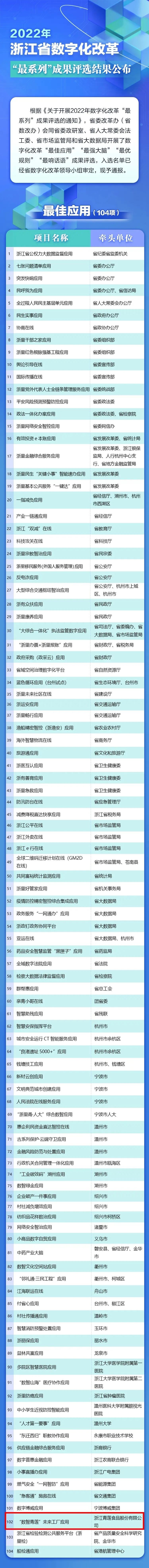 10月29日,省委改革辦(省數(shù)改辦)公布2022年數(shù)字化改革“最系列”成果。其中,浙江青蓮食品股份有限公司“數(shù)智青蓮”未來工廠獲得“最佳應用”殊榮,也是全省入選者中唯一一家未來工廠!