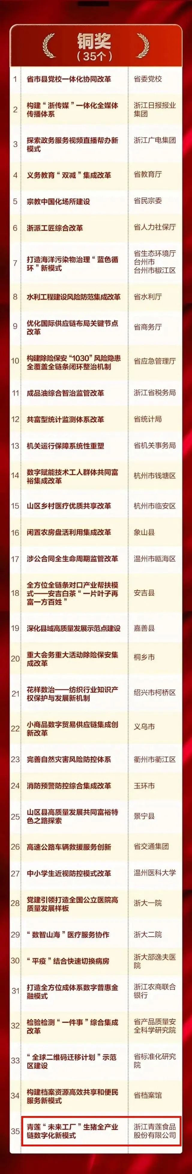 重磅!青蓮食品—膳博士榮獲浙江改革突破獎銅獎! 2023-02-02 08:37:26 浙江青蓮食品股份有限公司 瀏覽次數(shù) 7449 近日,浙江省委改革辦公布了2022年度浙江省改革突破獎名單。浙江青蓮食品股份有限公司“數(shù)智青蓮”未來工廠榮獲2022年度浙江省改革突破獎銅獎,是銅獎組中唯一的一家民營企業(yè)。20多年來,青蓮食品構(gòu)建起從農(nóng)場到餐桌的透明全產(chǎn)業(yè)鏈,在改革創(chuàng)新中以種業(yè)為源頭,建立起未來農(nóng)場—未來工廠—產(chǎn)業(yè)新零售等數(shù)字化應(yīng)用,真正從用戶需求出發(fā)為社會提供優(yōu)質(zhì)食品!此次獲得浙江改革突破獎銅獎,更是對青蓮食品數(shù)字化轉(zhuǎn)型成果的肯定和勉勵!實現(xiàn)黑豬專家膳博士在安全和美味雙升級上硬核突破!身為黑豬專家,膳博士服務(wù)過世博會、世乒賽、國際馬拉松比賽,連續(xù)8年為世界互聯(lián)網(wǎng)大會供肉,連續(xù)14年為中國極地研究中心供肉,成為杭州亞運會官方生鮮肉類產(chǎn)品供應(yīng)商。以國家級嘉興黑豬和兩頭烏保種場作為種業(yè)基礎(chǔ)繁育國家級優(yōu)質(zhì)新品種,形成完整的黑豬商品體系為消費者帶來舌尖體驗。近年來,通過智慧養(yǎng)殖為傳統(tǒng)畜牧產(chǎn)業(yè)數(shù)字化轉(zhuǎn)型先行探路,以新一代信息技術(shù)為手段,重塑生豬全產(chǎn)業(yè)鏈生產(chǎn)組織方式和管理服務(wù)模式,構(gòu)建“1+4+N”模型,推動全產(chǎn)業(yè)鏈數(shù)字化轉(zhuǎn)型。產(chǎn)業(yè)零售端以用戶需求為中心持續(xù)推出膳博士黑豬鮮肉鮮制系列產(chǎn)品提升消費體驗,滿足國人對美好生活、品質(zhì)食品的向往。2022年,青蓮智慧牧場首批入選浙江省“未來農(nóng)場”,“數(shù)智青蓮”未來工廠獲全省數(shù)字化改革“最佳應(yīng)用”和全省數(shù)字經(jīng)濟系統(tǒng)“最佳應(yīng)用”。在全省數(shù)字化改革大會上做匯報演示,列入全省數(shù)字經(jīng)濟系統(tǒng)地方特色應(yīng)用目錄,受到央視、省級、市縣級等媒體持續(xù)關(guān)注報道。 上一條“風云浙商”許明曙:人生把一件事做好就很不容易 下一條全國唯一!膳博士·香雪白豬獲2022年度國家新品種認定!